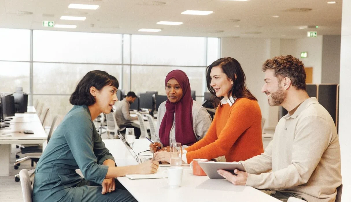 A laptop and a desktop monitor display a video conference with multiple participants, illustrating an online webinar or Q&A session