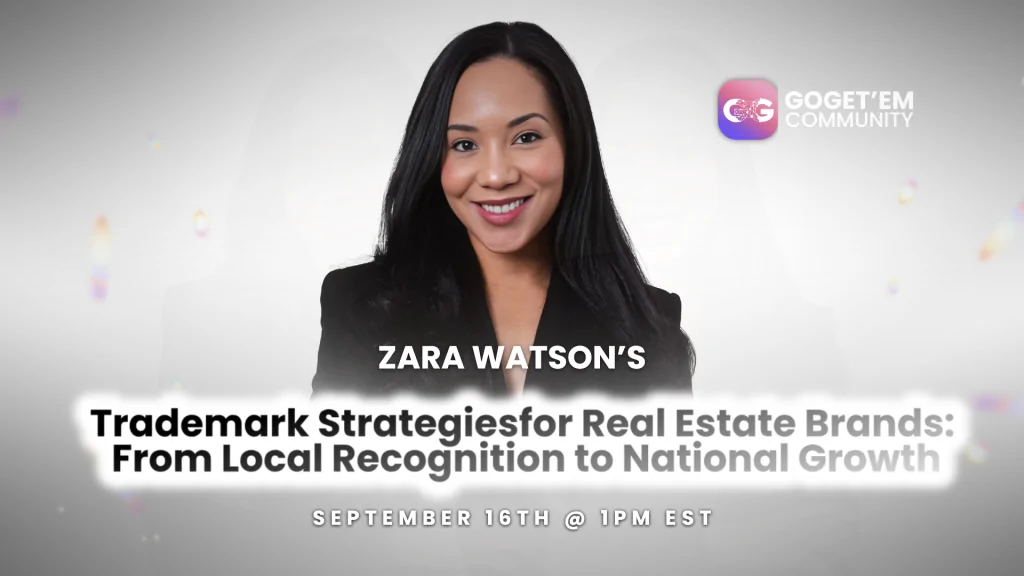 Most agents don’t think about this stuff until it’s too late. That’s exactly why we are bringing in trademark expert Zara Watson on September 16th at 1 PM EST for a live training inside the GoGet’Em Community.